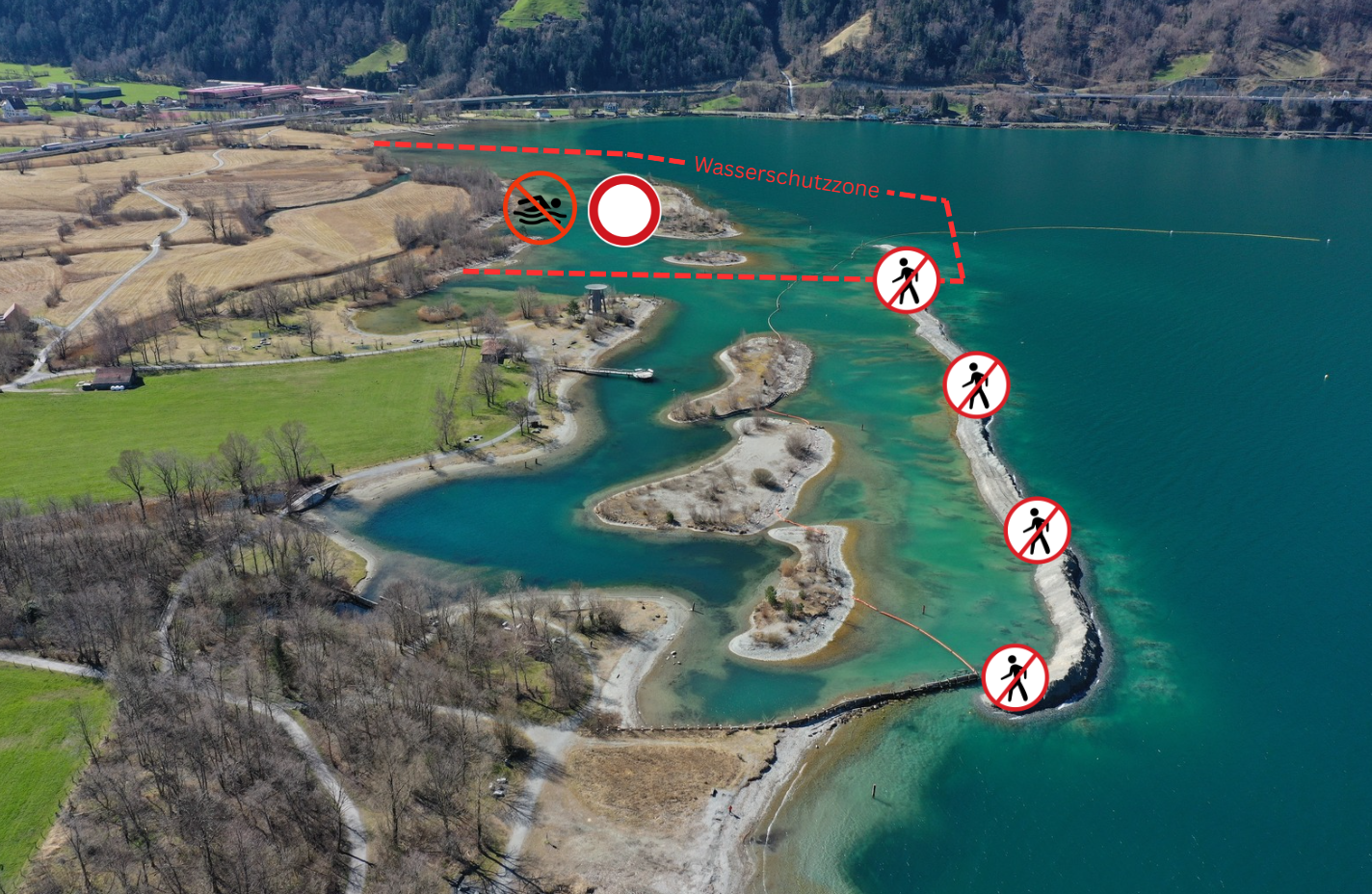 Zudem ist das Befahren der Umgebungszonen im Bereich Schanz (Badeinseln) zurzeit vom See her nicht möglich. Im Bereich Schanz wurde im Zusammenhang mit der Seeschüttung ein Schutzdamm erstellt. Der Damm dient als temporärer Schutz des Seeufers und Badebereichs vor Schwebstoffen sowie Trübungen und als naturnahe Baustellenabsperrung. Der Damm darf weder betreten noch als Anlegestelle für Boote oder Wassersportgeräte genutzt werden. Weitere Infos zur Seeschüttung finden Sie hier.